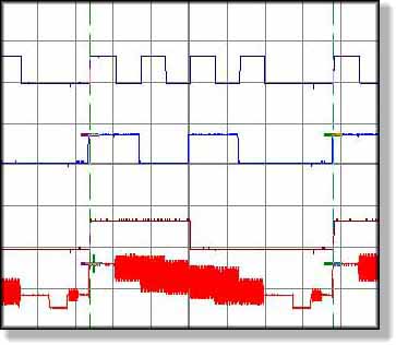 200mV/div 10µs/div Das Farbsignal wird im Fernseher mit Hilfe des Farbhilfsträgers und dem Burst zurück gewonnen. Um die Bildröhre ansteuern zu können müssen die drei Grundfarben Rot, Grün und Blau getrennt und Verstärkt werden. Diese sind im Oszillogramm oben zusehen, zuerst Blau dann Rot und zuletzt Grün. Sind alle drei Signale auf High erscheint das Bild Weiß, sind alle Signale auf Low ist das Bild Schwarz.